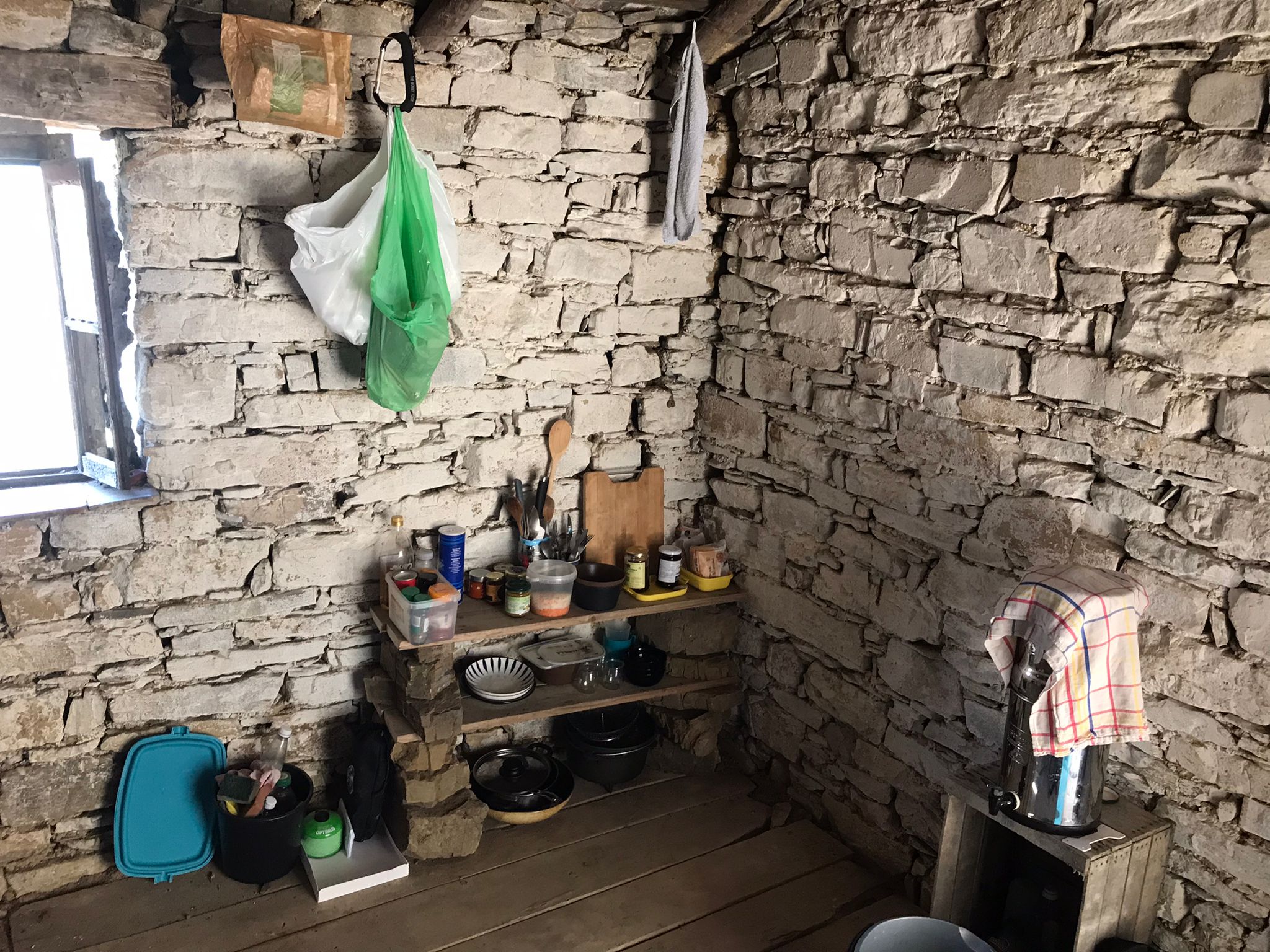 Nous sommes chaque fois au maximum 10 personnes séjournant sur place, afin que chacun trouve suffisamment d’espace pour être seul.e ou ensemble. Des nouvelles dynamiques émergent de nos interactions, chacun.e avec ses sentiments personnels, différents langages et besoins de repos et de distraction, avec sa créativité, ses talents, ses qualités et ses pièges, ses souhaits et ses possibilités. On campe dans une tente, on dort dans un hamac sous le ciel nu, ou on loge dans une chambre d’hôtes dans le village voisin. La petite maison est notre lieu de rencontre, et pourra devenir aussi un lieu d’hébergement.